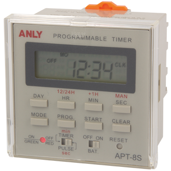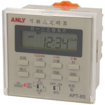 Prev Next Timer Programmable Timer APT-8S WEEKLY PROGRAMMABLE TIMER Add to inquiry Inquiry list Description Wiring and timing diagrams Overall dimensions or other Download Weekly programmable timer 8 different timing settings per day 15 different weekly combinations (See chart below) Built-in Lithium battery prevent power outage up to one year Crystal oscillator for extreme accuracy Up to 99 days holiday suspension Built-in Lithium battery prevent power outage up to one year Daylight-saving-time function Backlit LCD for easy viewing UL, C-UL recognized and CE certified APT-8S Catalogue APT-8S/APT-9S Users Manual