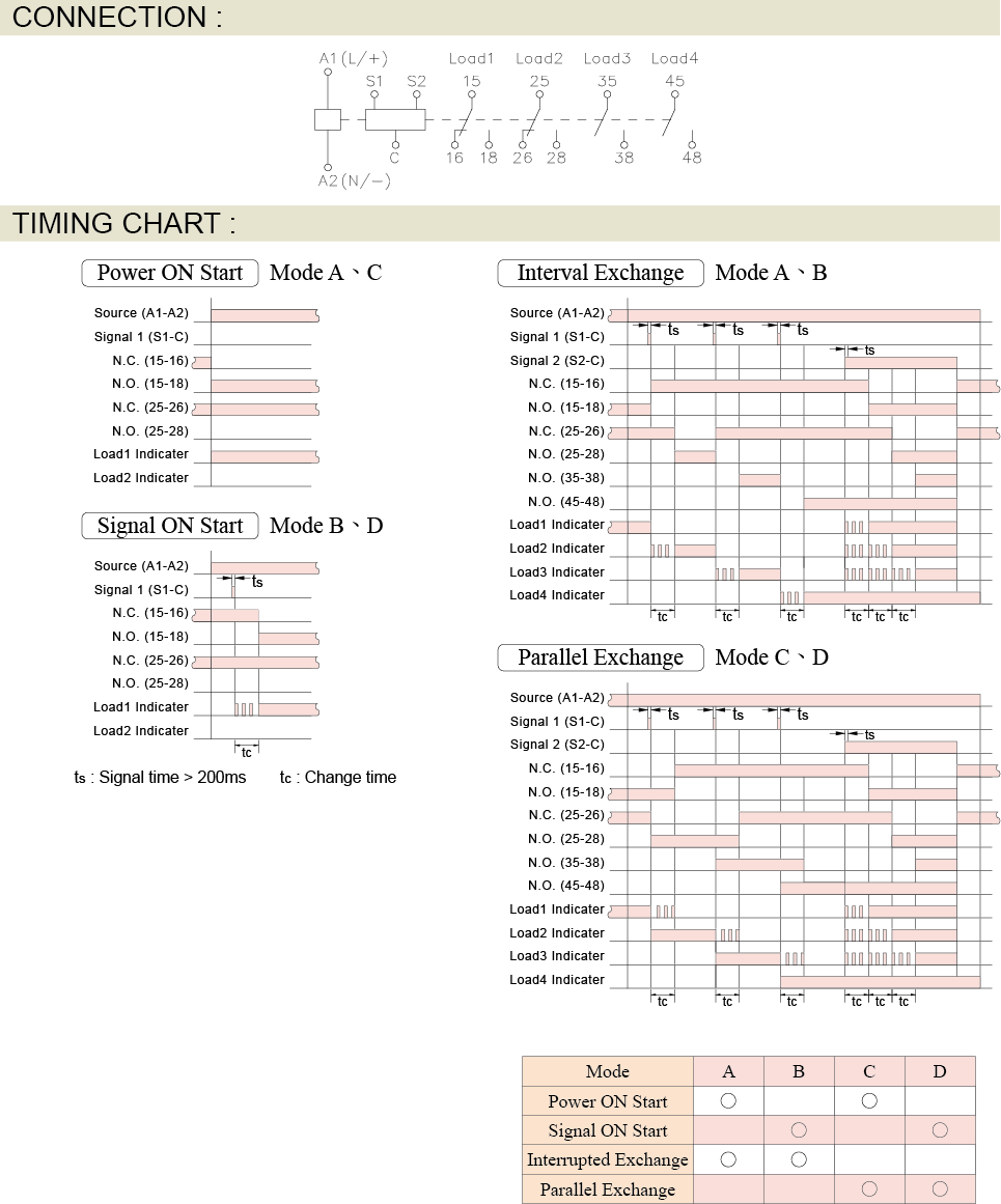 Next Control Relay Exchange Relay EC4-1 EXCHANGE RELAY Add to inquiry Inquiry list Description Wiring and timing diagrams Overall dimensions or other Download Switching Mode Power Supply for 100~240V AC/DC operation Up to 4 loads can be individually selected via DIP switch Up to 11 load combinations are possible (Please see the table below) Load 1 & 2 are C/O contacts; Load 3 & 4 are N.O. contacts Change Time between loads can be adjusted from 0.2 to 10 sec S1, Load exchange signal can be rising-edge or falling edge S2, All-On signal can force all selected loads to start sequentially Load Memory can let users chose to either resume the running load or to always start from Load 1 after a power reset A power reset is required for setting changes to take effect EC4-1 Catalogue EC4-1 Users Manual