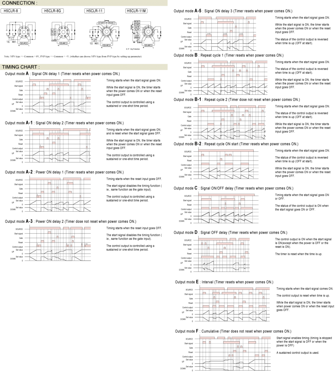 Prev Next Timer Digital Timer H5CLR MULTI-FUNCTION DIGITAL TIMER Add to inquiry Inquiry list Description Wiring and timing diagrams Overall dimensions or other Download Eleven field-selectable output modes accommodate a wide variety of applications 7-segment-display for clear display and effective monitoring All parameters set by scrollthrough menus accessed from the front panel Field-selectable time ranges from 0.001 second to 9999 hours Precision control possible to 0.001 second Four levels of key protection provided Count Up or Count Down mode user selectable Memory function available UL, C-UL recognized and CE certified H5CLR Catalogue H5CLR/ASY-4DR Users Manual